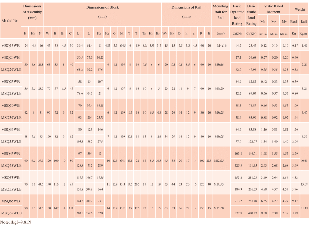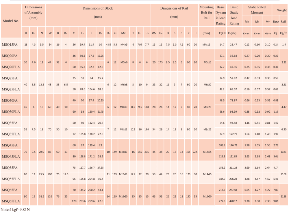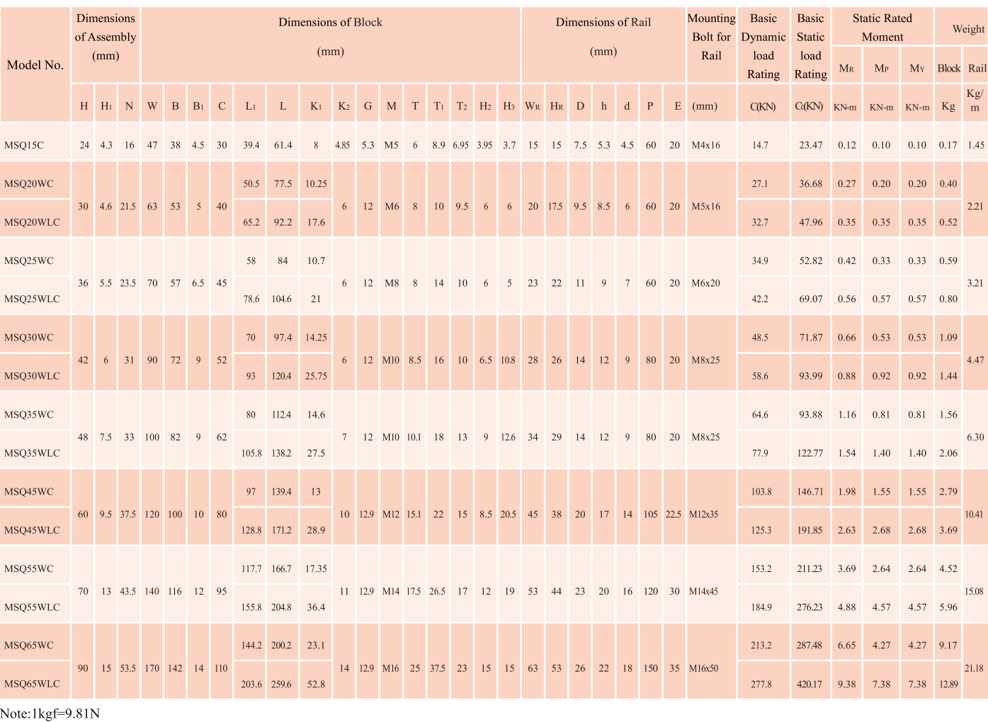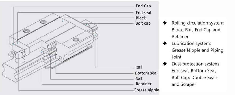 Because of precision dimensional control, the dimensional tolerance of MSQ series can be kept in a reasonable range, which means that any blocks and any rails in a specific series can be used together while maintaining dimensional tolerance. And a retainer is added to prevent the balls from falling out when the blocks are removed from the rail.