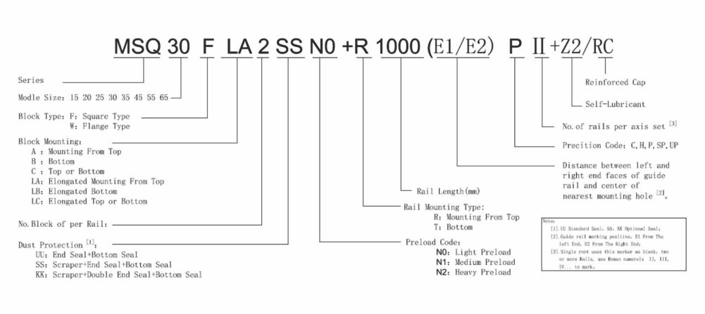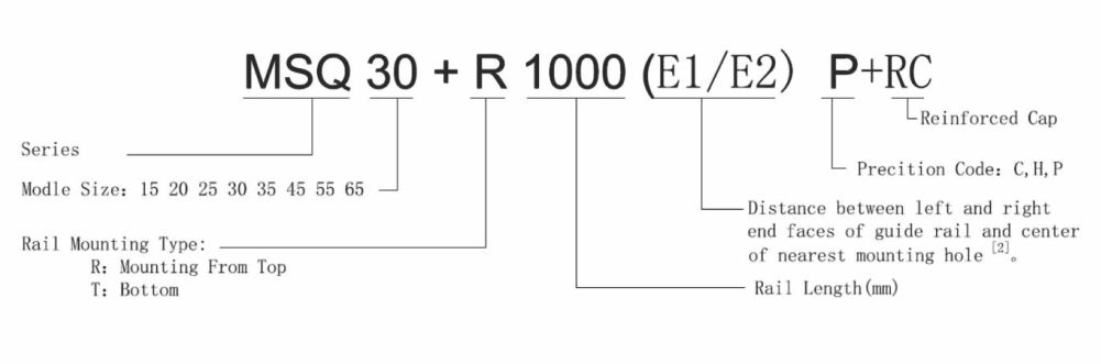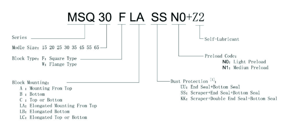 MSQ series guideways can be classified into non-interchangeable and interchangeable types. The sizes are identical. The only difference between the two types is that the interchangeable type of blocks and rails can be freely exchanged and their accuracy can reach up to P class. The model number of MSQ series contains the size, type, accuracy class, preload class, etc.