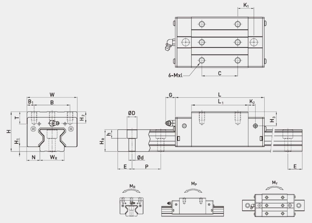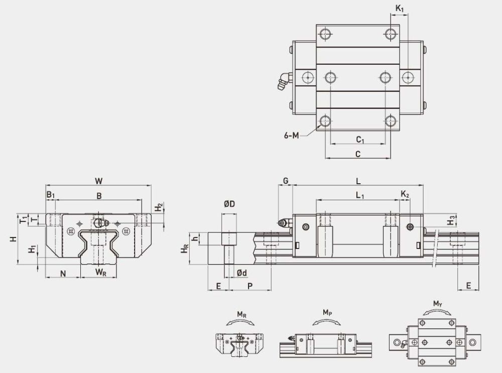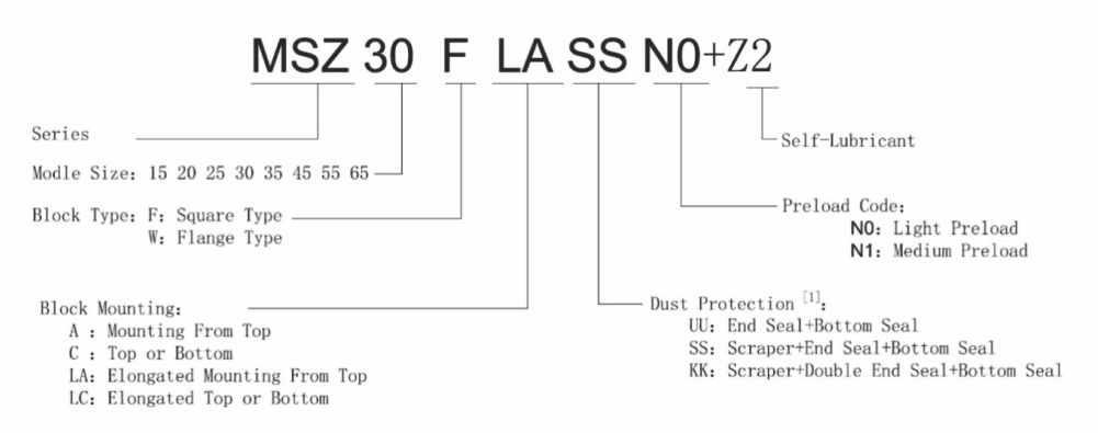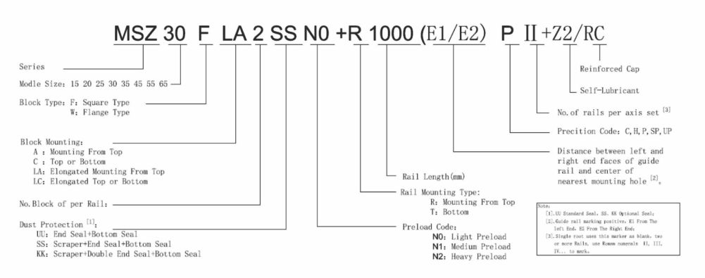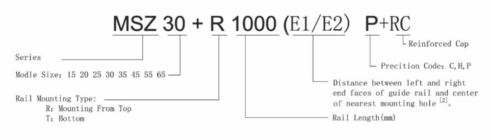 MSZ series linear guideways are classified into non-interchangeable and interchangeable types. The sizes of these two types are the same as one another. The main difference is that the interchangeable type of blocks and rails can be freely exchanged and they can maintain P-class accuracy. Because of strict dimensional control, the interchangeable type linear guideways are a wise choice for customers when rails do not need to be matched for an axis. The model number of the RG series identifies the size, type, accuracy class, preload class, etc.