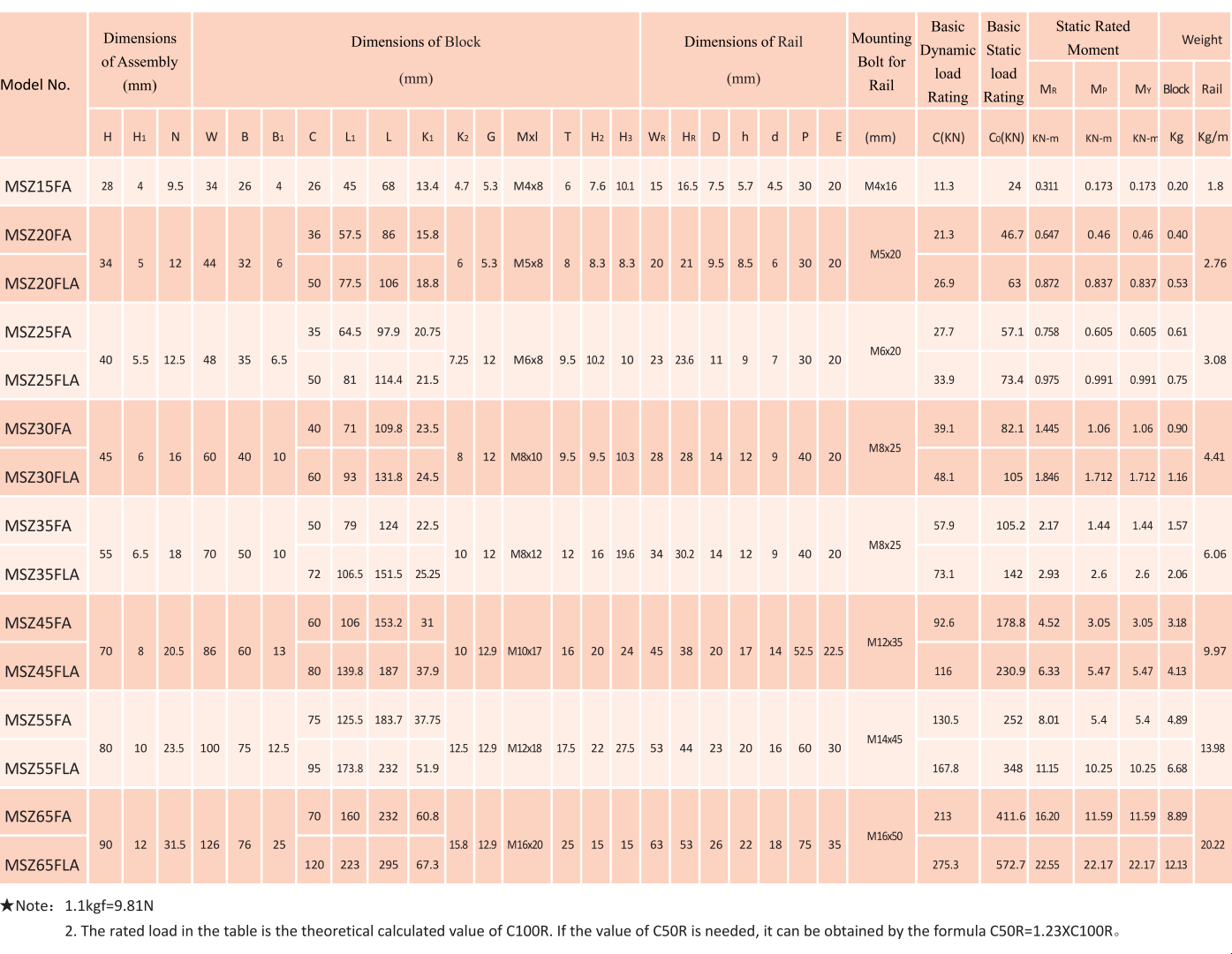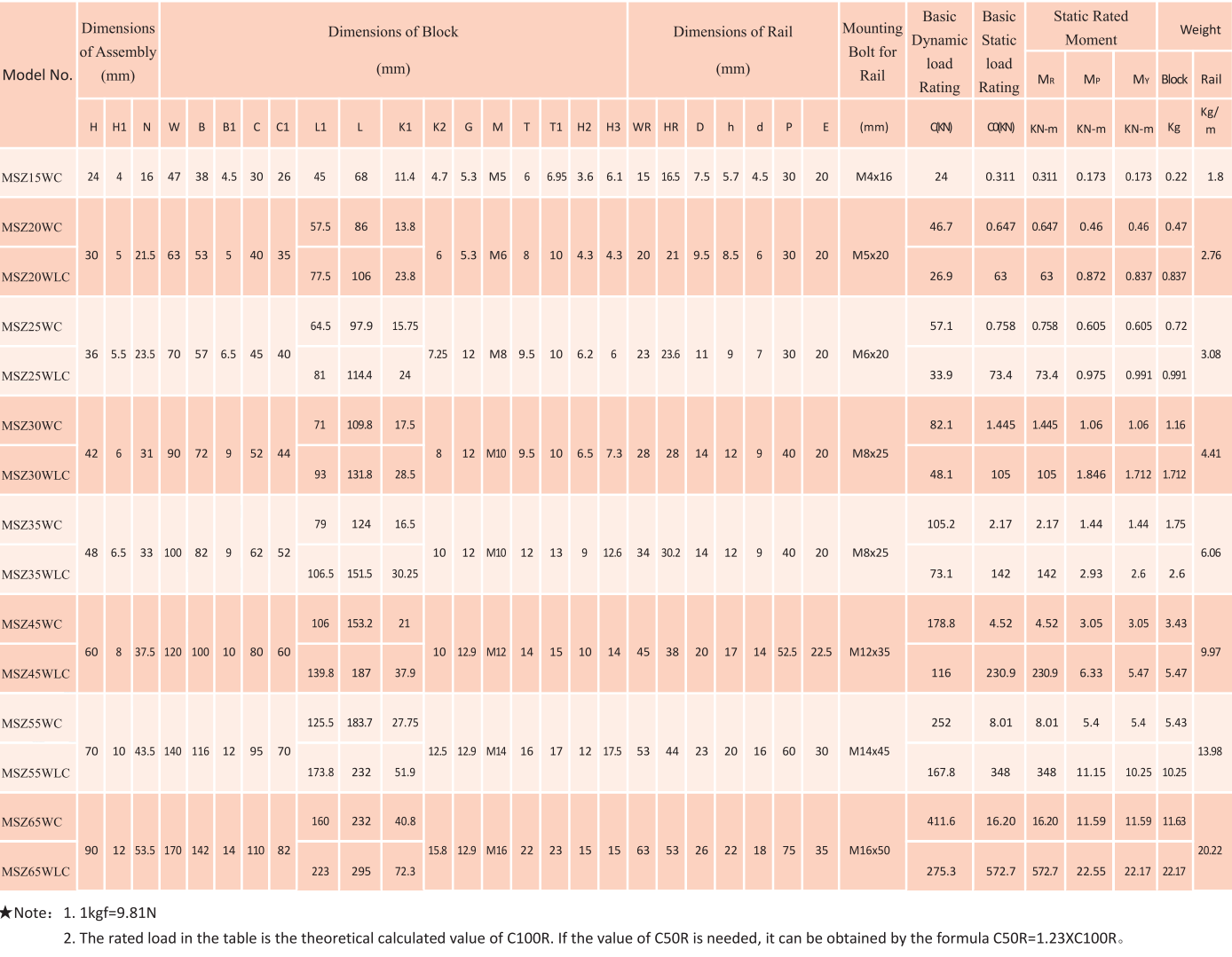 Compare with the ball element, the contact pressure of rolling element is distributed on the line region. Therefore, stress concentration was reduced significantly and the MSZ series offers longer running life. The nominal life of MSZ series can be calculated by using Formula.